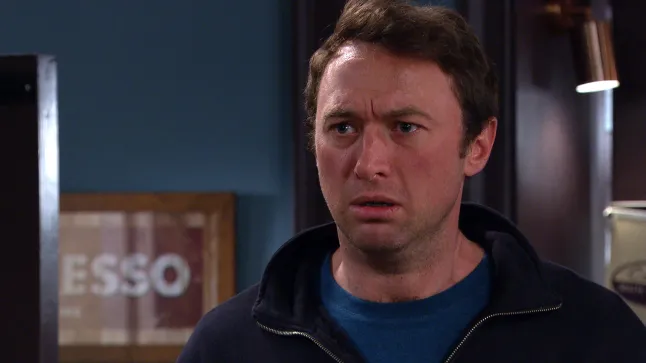 Liam in the cafe looking worried in Emmerdale