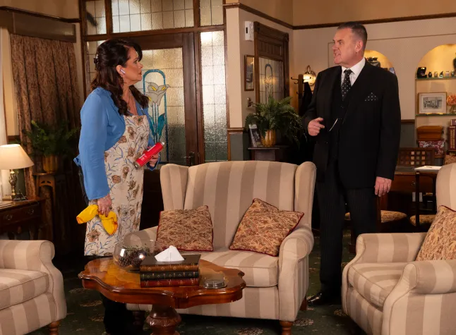 Yesterday, Christina was in the Undertakers with George and made a joke about inveigling his way into clients’ will. He was left completely mortified after, as George discovered potential client Mrs Ripley had overheard the entire exchange.